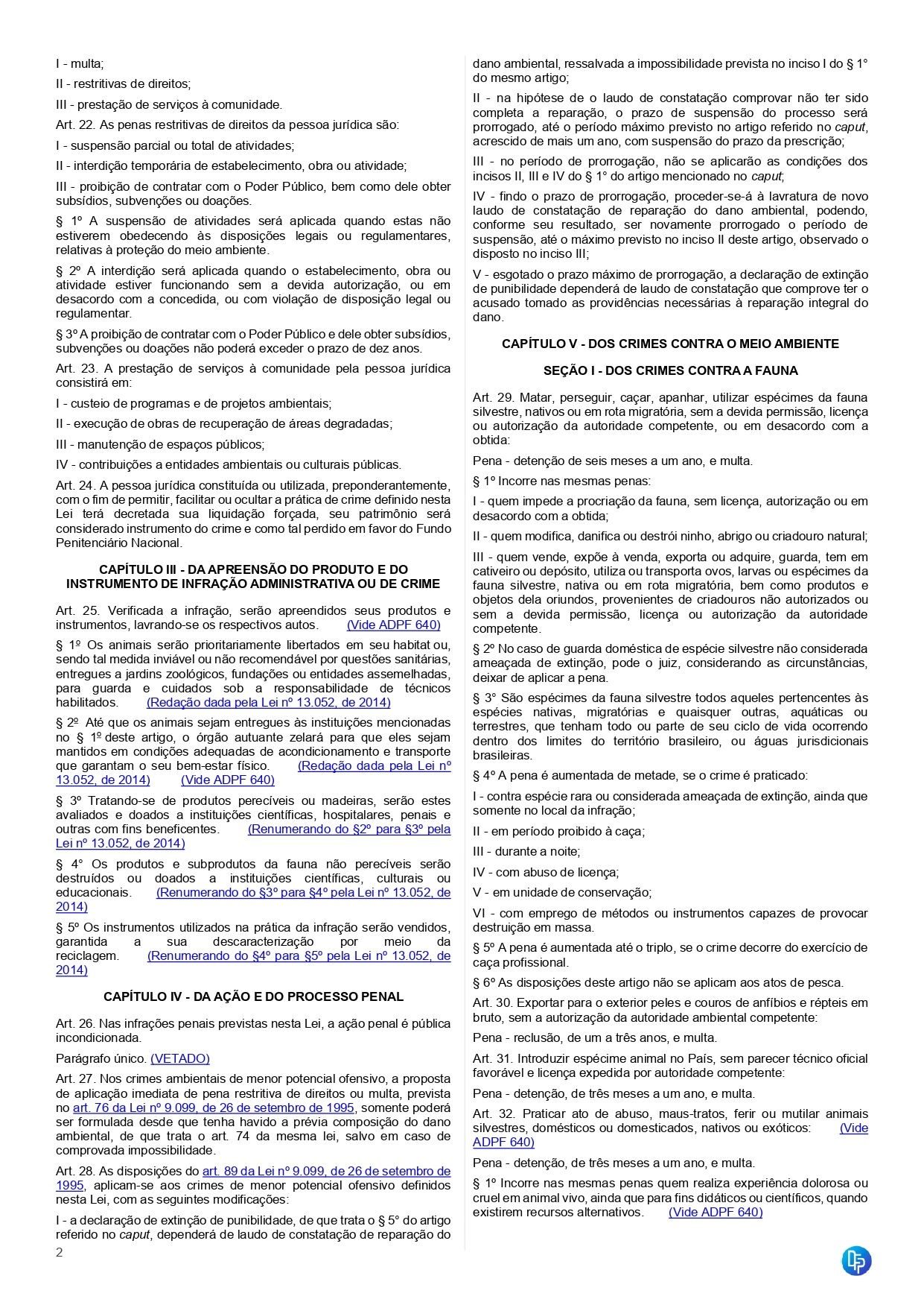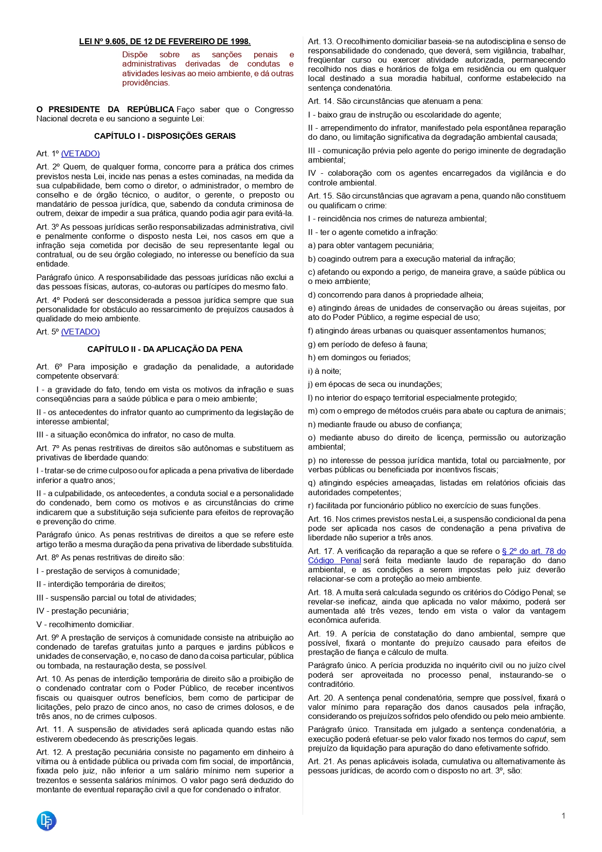 Texto completo da Lei 9.605/1998 (Crimes Ambientais), sempre atualizado e organizado em formato claro e objetivo.